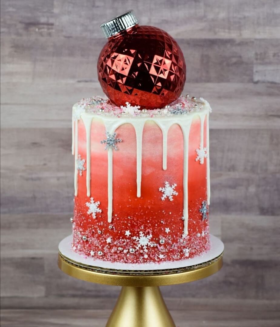 Просто красивый новогодний тортик с украшением в виде яркого елочного шарика